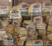 Käsetheke (mit Bedienung) mit vielen Käsen aus der Region, Kuh- und Schafkäse, Ziegenkäse, Raclettekäse, und als weitere Spezialität: Fondue-Hausmischung, Käseplatten